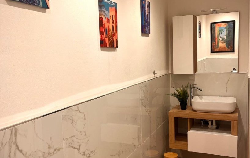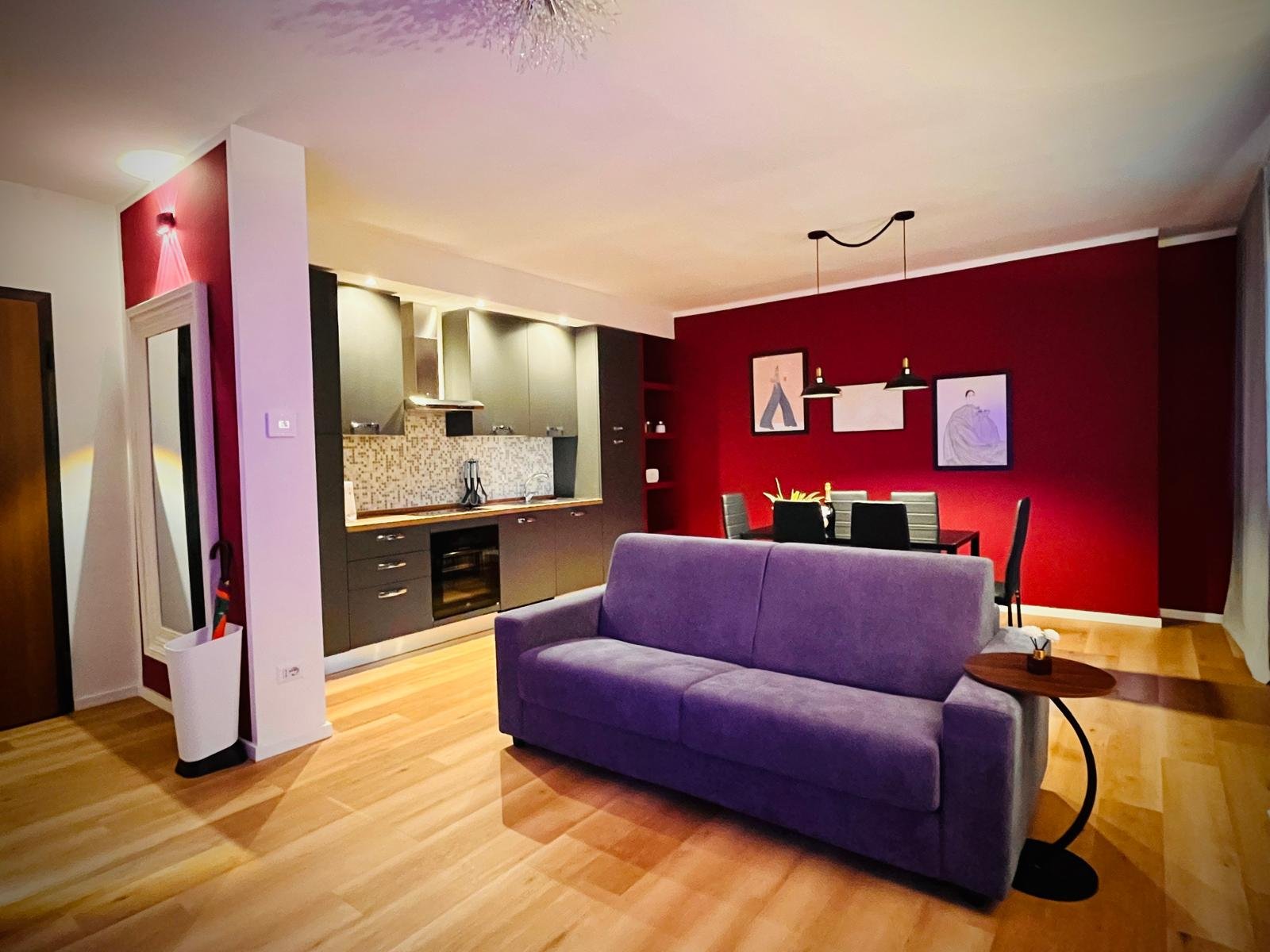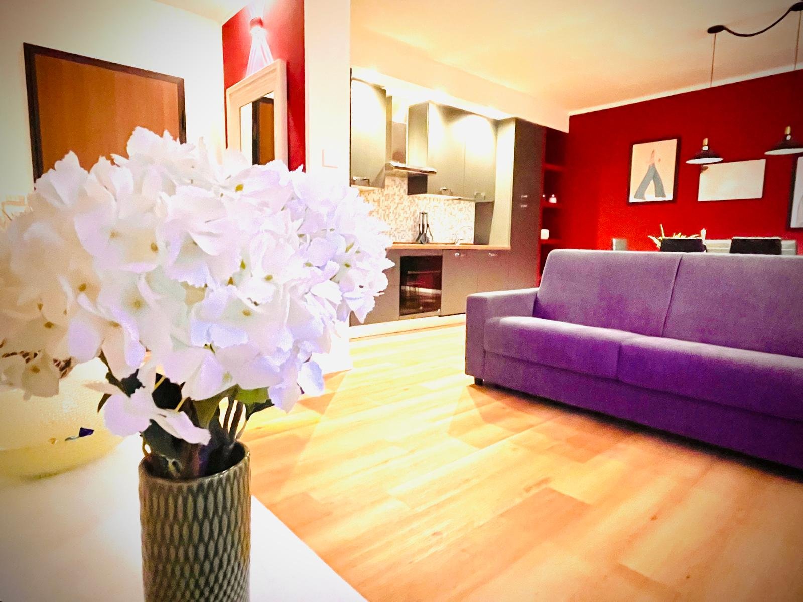 Appartamento di circa 70 mq, che celebra lo stile Art Decò in una esplosione di colori e forme audaci. Le pareti dipinte di un vibrante rosa fragola brillante e la luce naturale proveniente dall’esterno rendono questo ambiente di sala-cucina estremamente affascinante. Un profondo blu intenso in camera da letto, contornato da tendaggi porpora creano una atmosfera lussuosa e dinamica esaltata da quadri ispirati alla passione e dettagli eleganti.