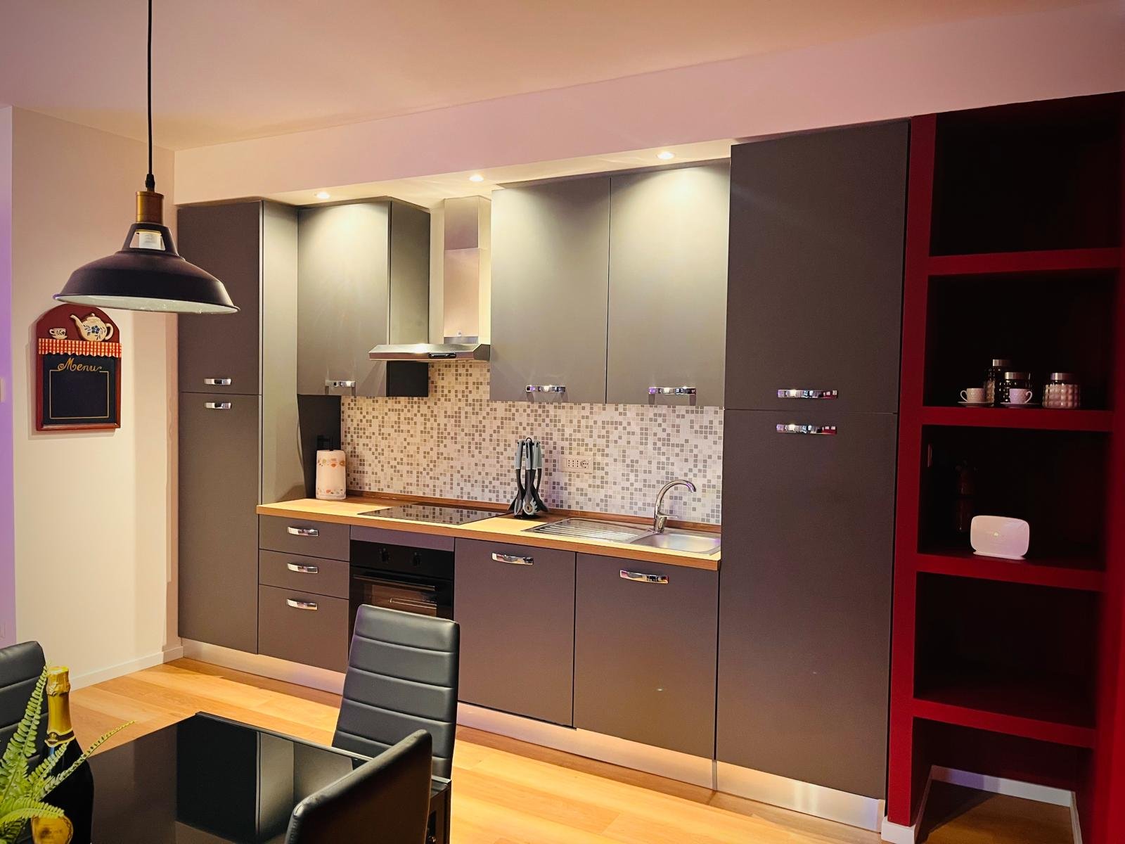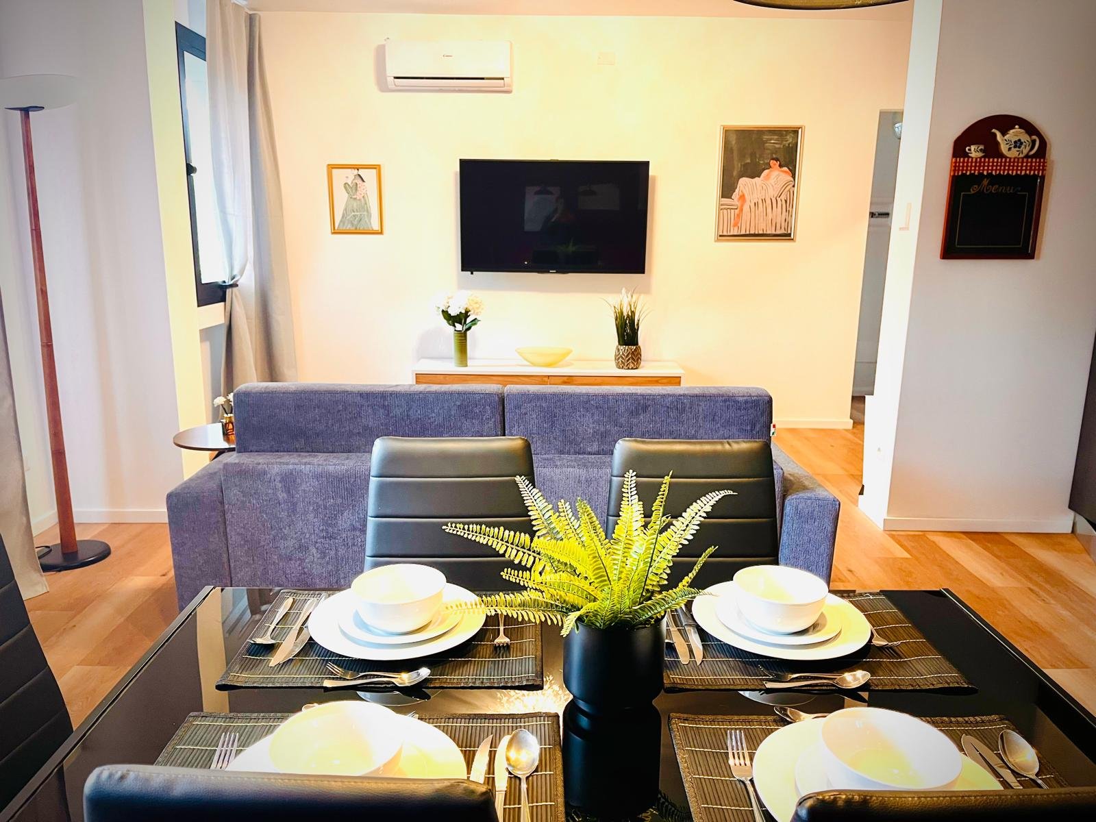 Servizi in appartamento: Aria condizionata, Cucina, Lavatrice e Asciugatrice, Divano (letto matrimoniale), Parquet, Biancheria da letto, Presa elettrica vicino al letto, Prodotti per le pulizie, Beni di prima necessità (zucchero, caffè, sale, olio, aceto)
