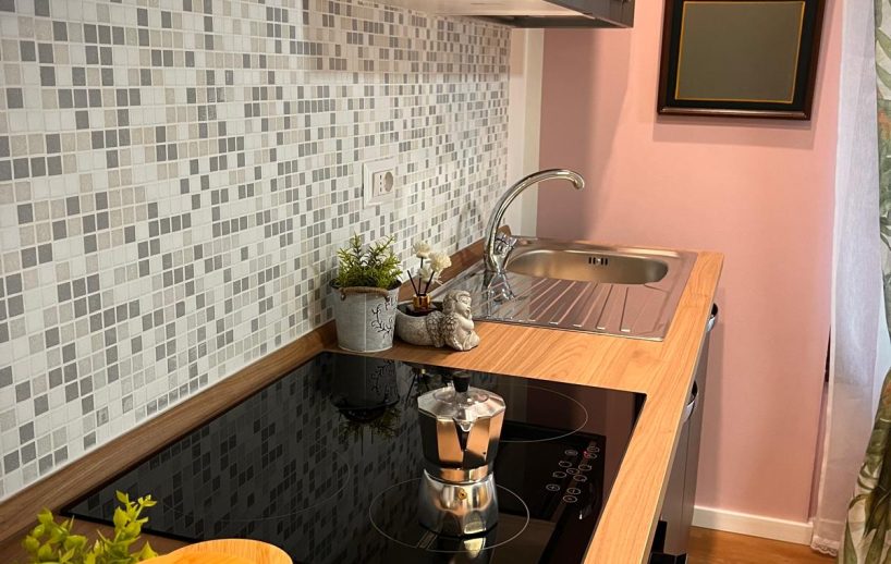 L’ingresso conduce direttamente ad un open space che unisce la zona giorno e l’angolo cottura creando un ambiente ideale per socializzare e rilassarsi.