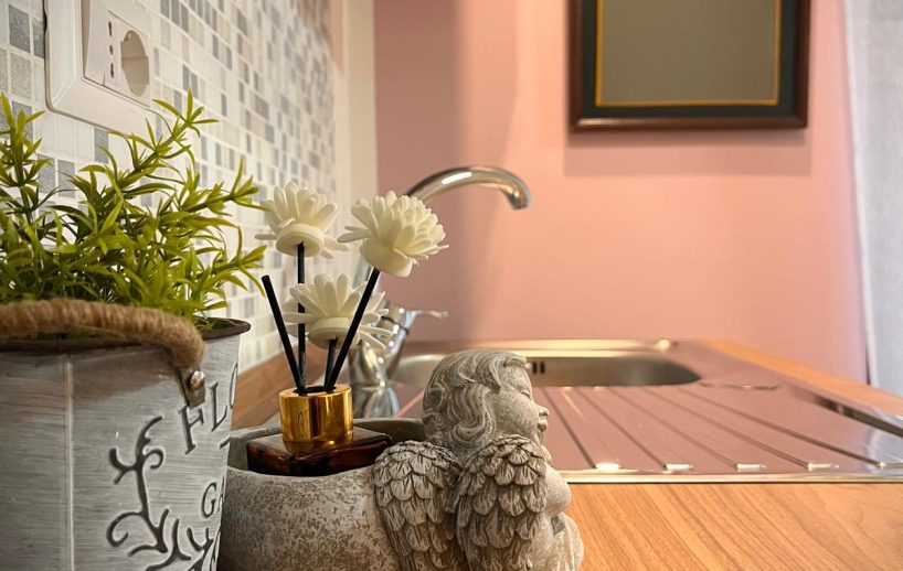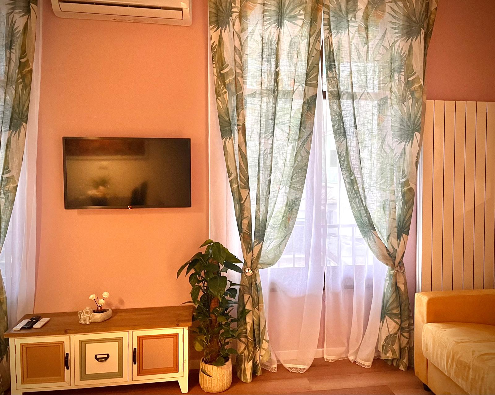 Le pareti non sono semplici sfondi ma tele viventi: una sintonia di colori che va dal rosa tenue al lilla lievemente brillantinato al giallo zafferano del divano letto (matrimoniale), per poi passare ad un verde tenue sulle tende.