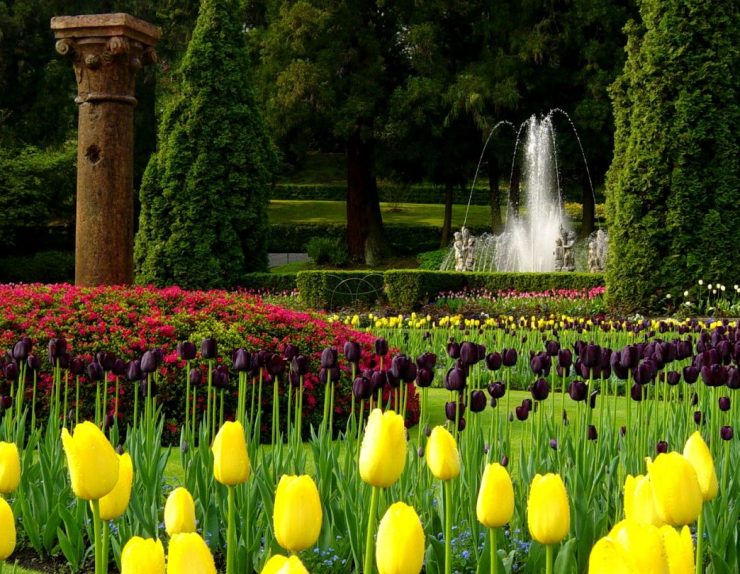 Primavera ed estate sono un’esplosione di colori: tulipani, rododendri, azalee, dalie e ninfee creano scenari di straordinaria bellezza. In autunno, le tonalità calde delle foglie trasformano il parco in un quadro impressionista, mentre anche l’inverno conserva un fascino discreto e ordinato.